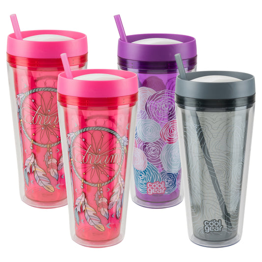 4 Pack COOL GEAR 24 oz Callisto Printed Chiller with Straw | Dual Function Closure Printed Re-Usable Tumbler Water Bottle